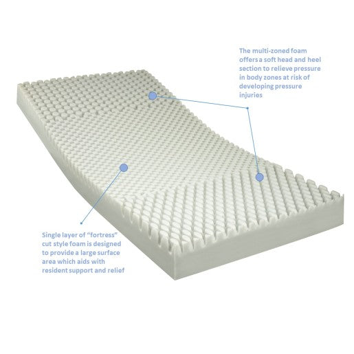 Featuring special zoned layers of high density foam for aid in pressure relief on areas susceptible to pressure ulcers and soft head and foot sections for ultimate comfort, this dual-layered mattress has the comfort and technology that users need.
